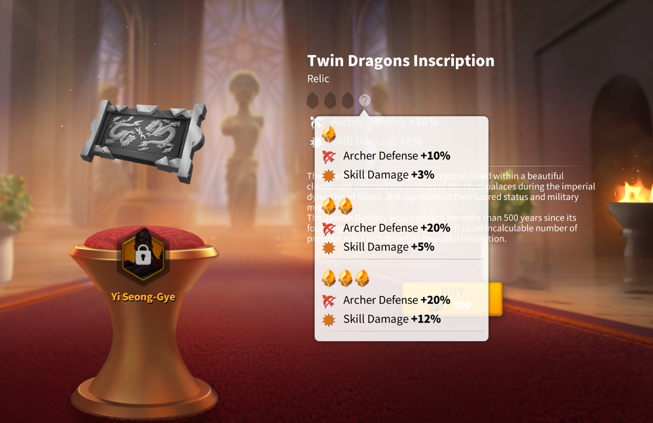 At max upgrade, YSG gains 20% defense and 12% additional skill damage, maintaining his viability even in Season of Conquest (SoC) battles.